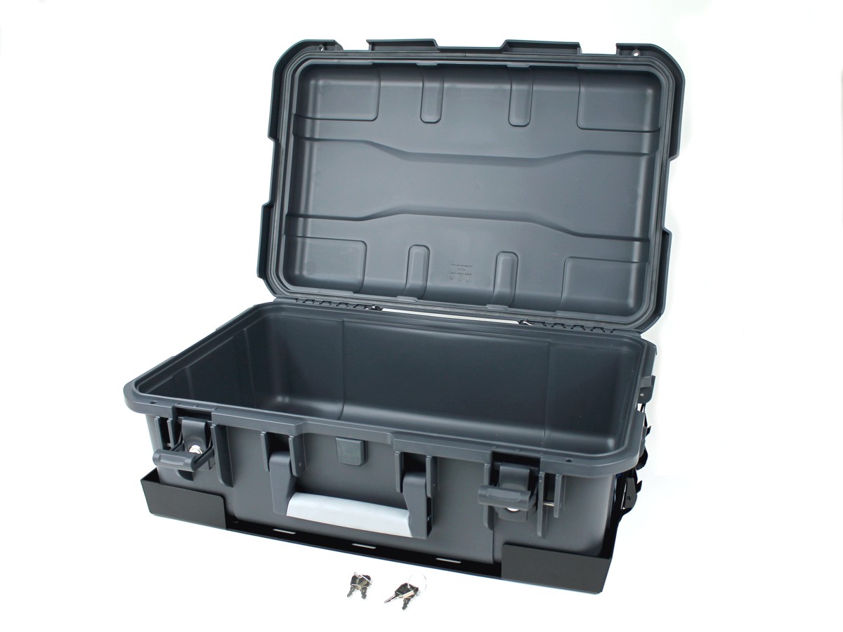 Im Lieferumfang enthalten sind die Halteplatte, ein Auer Schutzkoffer Pro (bitte Größe wählen), 6 Schrauben zur Befestigung auf unserem Back-Rack Träger und 4 schwarze Spanngurte. Die Halteplatte ist schwarz pulverbeschichtet, der Auer Schutzkoffer ist anthrazitgrau ähnlich RAL 7016.