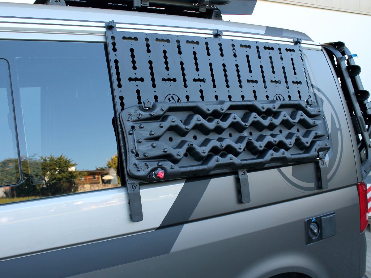 Entdecke das innovative Back-Rack für deinen Original VW-Logo Fahrradträger! Entwickelt von Adventure Van, bietet dieses Produkt zahlreiche Vorteile und Alleinstellungsmerkmale.Die CNC-gefrästen Aluminiumhalter wurden speziell an den Träger angepasst und sorgen für eine robuste Befestigung. Die Edelstahlschienen ermöglichen vielfältige Befestigungsmöglichkeiten für zusätzliches Equipment wie Wassertanks, Reserverad, Stauboxen oder Werkzeug.Die Montage des Back-Racks ist kinderleicht und schnell erledigt. Einfach die Aluhalter über das Profil des Fahrradträgers stecken, das Gegenstück von hinten anbringen und festschrauben – schon sitzt der Halter sicher. Die Edelstahlschienen werden einfach über den Halter geschoben, festgeschraubt und können dank der Langlöcher individuell angepasst werden.Das pulverbeschichtete Design in Schwarz verleiht deinem Bulli eine coole Offroad-Optik. Mit dem Back-Rack erhalten Sie nicht nur mehr Platz und Befestigungsmöglichkeiten, sondern auch modulare Erweiterbarkeit. Egal ob du längere Reisen planst oder zusätzliches Equipment transportieren möchten – das Back-Rack passt sich deinen Bedürfnissen an. Erhältlich in praktischen 2er oder 4er Sets, lässt es sich mit einer Vielzahl von Erweiterungen kombinieren. Investiere in das Back-Rack und erleben die vielseitigen Möglichkeiten, die es dir bietet. Mache dein Abenteuer komplett und sichere dir noch heute dein eigenes Back-Rack!Nur kompatibel mit dem original VW Logo Fahrradträger mit der Teilenummer: 7H0071104 oder 7E0071104B.Daten "Back-Rack"Länge: 920mmBreite: 45mmGewicht: 2000gMaterial: Edelstahl / Aluminium Farbe: RAL 9005 schwarzVorteile "Back-Rack"Einfache und schnelle MontageSchöne Optik und robuste Oberfläche dank hochwertiger Pulverbeschichtung100% Made in "Bavaria"Plastikfreier VersandVielseitig einsetzbarErweiterung deines StauraumsModular erweiterbar Das auf den Bilder dargestellte Zubehör dient nur zur Veranschaulichung und ist nicht im Lieferumfang enthalten. Die Montage und Verwendung dieses Artikels erfolgt auf eigenes Risiko. Es liegt keine TÜV-Zulassung vor und wir übernehmen keine Verantwortung für mögliche Schäden am Fahrzeug.